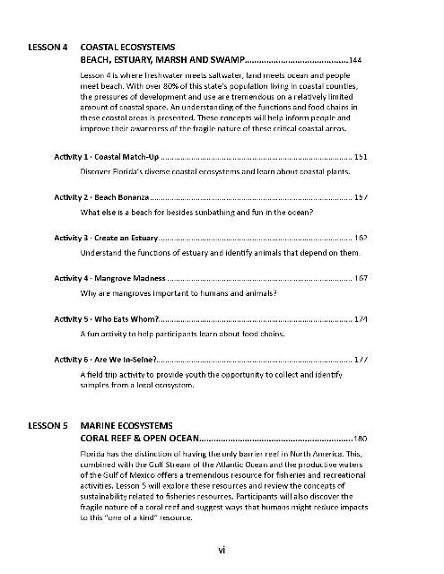 Florida has the distinction of having the only barrier reef in North America. This, along with the Gulf Stream of the Atlantic Ocean and the rich biodiversity of this state’s coastal offers a tremendous resource for fisheries and recreational activities. Lesson 5 explores these resources, evaluates the need to conserve these resources and explores management strategies. The activities are intended to help participants understand the effects of humans on marine and coastal environments and suggest ways that humans might reduce impacts to this “one of a kind” resource.