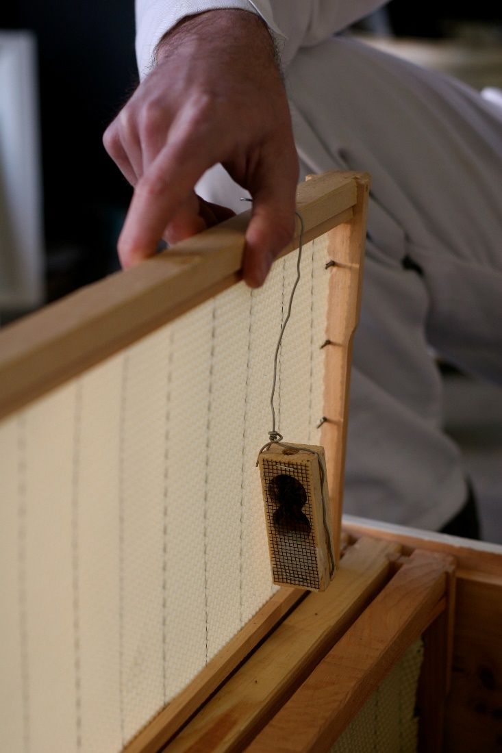 Queen cage: A small container that safely holds the queen while she is being marked or while the beekeeper is working the hive.