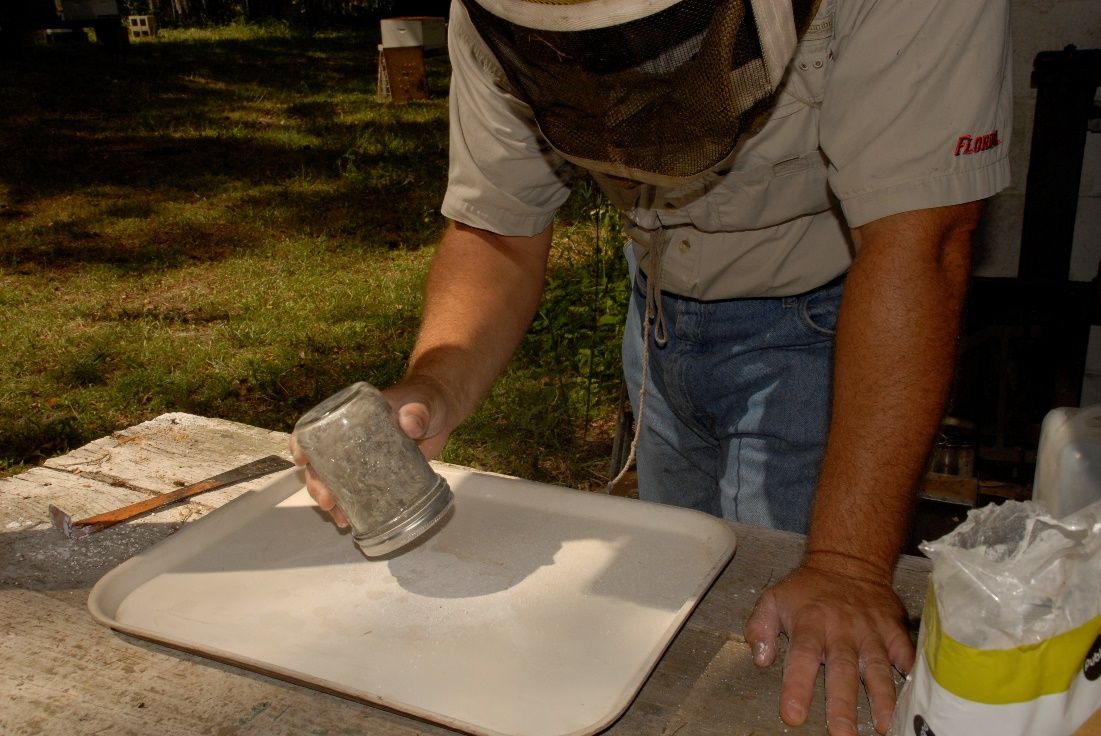 Sugar shake: A non-lethal test to determine Varroa destructor (mite) population in a honey bee colony.