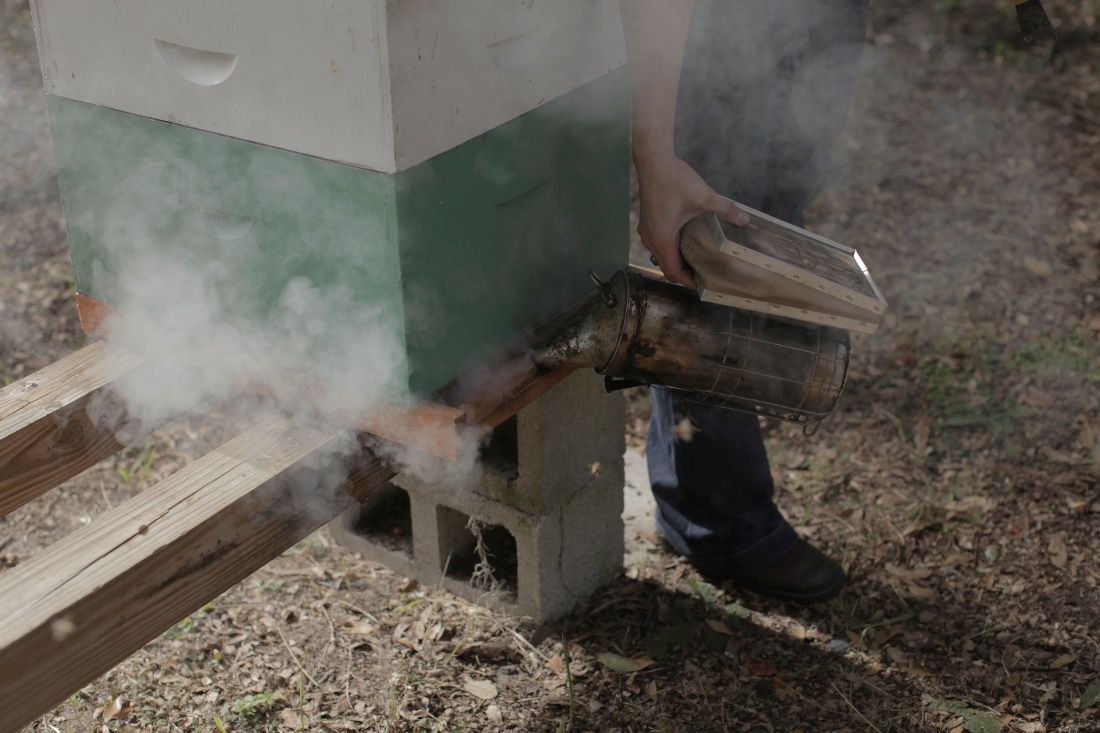 Smoker: A tool for blowing smoke into a hive to calm the honey bees before working about the hive.