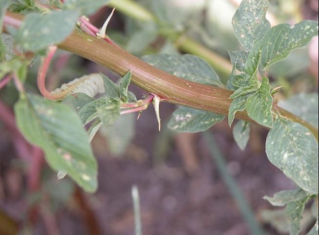 Spiny amaranth is particularly troublesome because sharp spines proliferate on the stem (Figure 3). This greatly deters grazing around the plant because animals avoid the sharp spines. Also, this weed is an abundant seed producer with well over 100,000 seeds per plant produced each year. The seeds germinate throughout the warm summer months, and each rainfall event results in another flush of spiny amaranth plants.