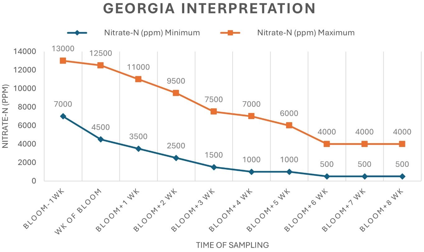 Consider also monitoring petiole phosphorus (P) levels, especially during blooming, as this can provide additional insight into stress factors affecting NO3-N levels. For example, in the first week of bloom, if the NO3-N concentration is between 10,000 ppm and 35,000 ppm and the P concentration is above 800 ppm (0.08%), the plants have sufficient N to support healthy growth and development. However, if the P concentration drops by more than 300 ppm from one week to the next, it may signal plant stress, possibly due to water deficiency. In such cases, it is prudent to wait for the next test results before adjusting N fertilizer applications and to ensure plants are free from any stress (Parvej et al. 2021).