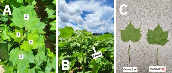 - Select the most recently matured, fully expanded leaf on the main stem, or generally the fourth leaf from the top of the plant. (Do not count the small leaves on fruiting spurs at the terminal end.) If unsure, choose a slightly older leaf rather than a younger one. However, avoid leaves directly supporting the bolls (if present), as these are important to supply nutrients to the developing boll tissue (Figure 1A and Figure 1B).