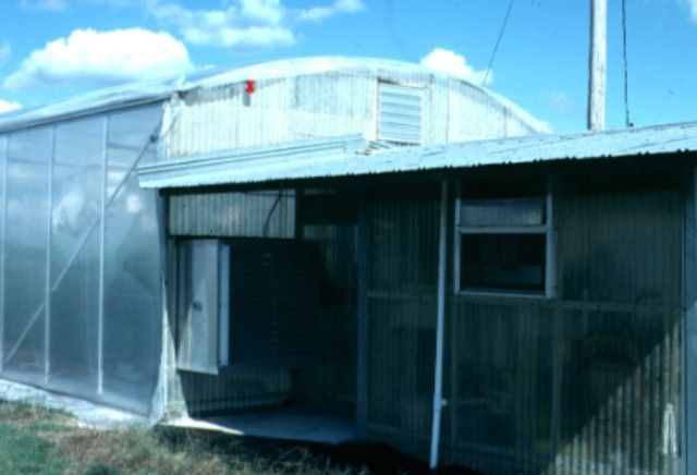 Greenhouses should be built with an "airlock" entrance design (Figure 3). This entrance porch prevents direct ingress of wind, insects, soil, and spores into the greenhouse. Such an entrance has the additional advantage of making doors easier to open and close when the fans are operating. The double entrance also prevents short-circuit air flow patterns when ventilation fans are in operation.