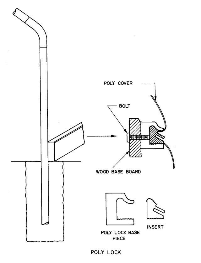 The polylock extrusion system is the set of aluminum extrusions that will hold the poly cover on the greenhouse frame. Typically, the system consists of, at least, baseboard and end wall (arch) aluminum extrusions and the accompanying inserts. The extrusions are mounted to the steel side columns and the endarches. Mounting procedures differ slightly depending on the greenhouse manufacturer. Houses with tall, straight sidewalls will have a third extrusion that mounts to the top of the column called an eave extrusion. The top of the eave extrusion holds an edge of the poly roof cover, and the bottom of the extrusion holds the top edge of the sidewall poly. The method by which the poly cover is fastened in the extrusion varies with greenhouse manufacturer. Some kits will use an insert that wedges the poly into a groove in the extrusion. The insert simply pops in place with the use of a special wedge tool. The extrusion/insert system is designed so that the normal "pull" of the poly tends to naturally tighten the hold of the insert; an example is shown in Figure 2.