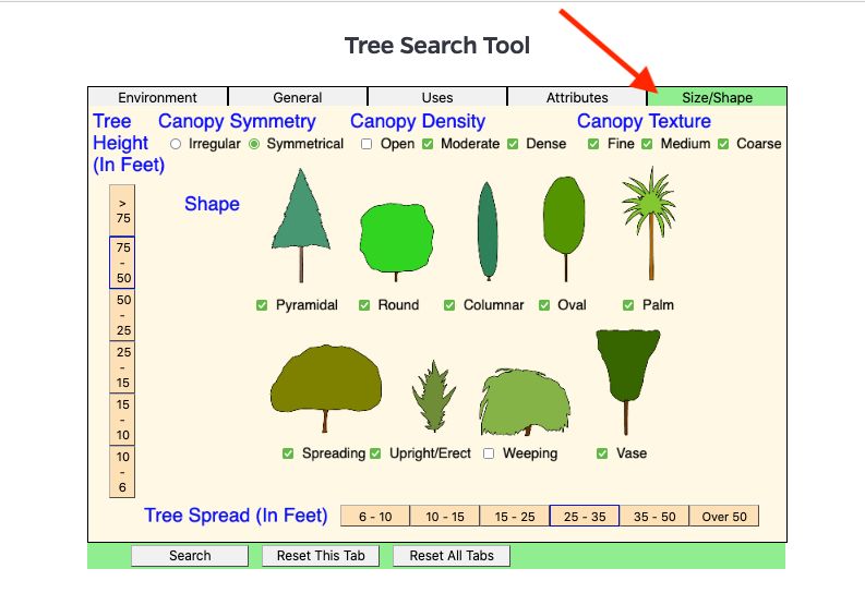 The Tree Search Tool can be used to generate a list of trees for a particular site depending on tree- and site-related factors (Figures 13–24). The user can select criteria from up to five tabs: Environment, General, Uses, Attributes, and Size/Shape. You can select as many or as few characteristics in each of the five tabs as you like to generate a list of potential trees. Note that the Tree Search Tool will allow the user to leave out important characteristics, which may result in suggestions for some less-than-desirable species. Whereas the Tree Recommendation Tool walks the user through a thorough site evaluation before searching the database for desirable trees. For example, you can use the Tree Search Tool to find all trees that grow in a particular hardiness zone or find trees with white flowers. However, they might not grow well at your site unless you consider other factors. That task is better suited for the Tree Recommendation Tool.