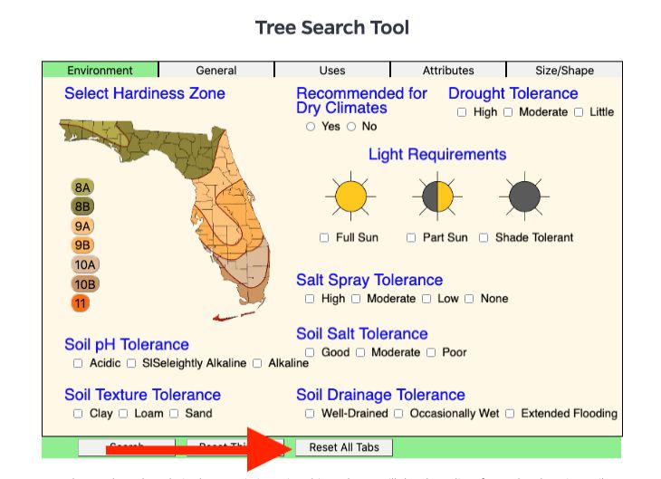 With all the tools provided on the Florida Trees website, a general rule of thumb is to avoid guessing. The Tree Search and Tree Identification tools can work without selecting a particular tree characteristic or site variable, and both features will generate a still suitable list of species based on the variables selected. Whereas the Tree Recommendation Tool requires an answer for every question to generate a list of suitable species. The Tree Recommendation Tool gives the best advice for selecting the appropriate trees for your site. The Tree Search and Tree Identification tools are useful for searching the tree database. Incorrect responses, no matter the tool, can render a list of species that might not be suitable for the site in question or result in the misidentification of a species.