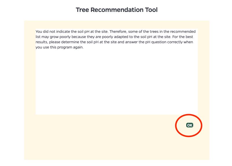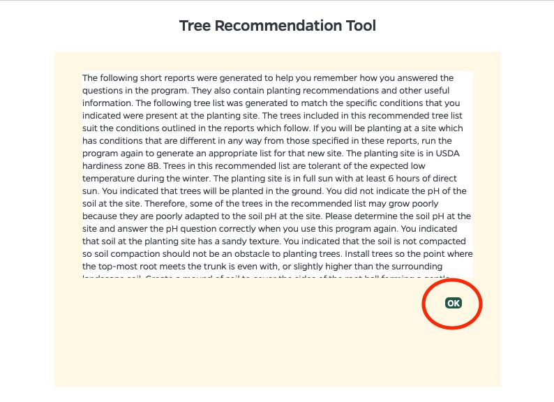To generate a list of trees based on characteristics of your desired planting site, use the Tree Recommendation Tool (Figures 2–12). This tool will ask a series of questions about your site. Then, your answers will be input into the tool to generate a list of suitable trees. Refer to Table 1 for clarity on what is inquired by each question.