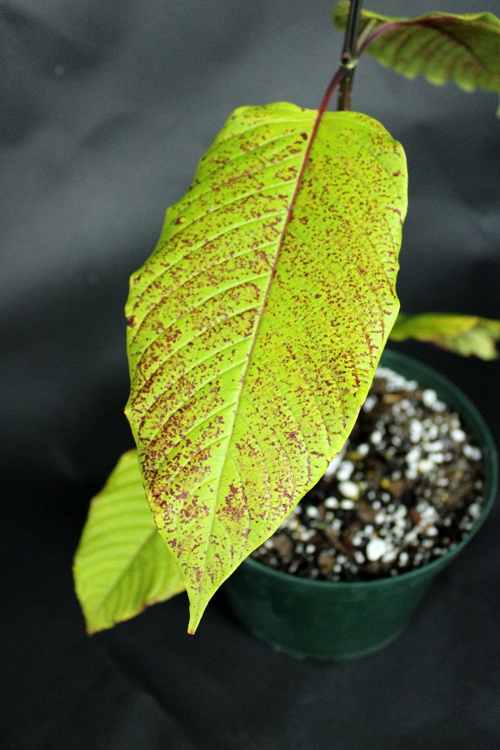 Generally, kratom trees prefer moderate to warm temperatures ranging from 73°F–86°F (23°C–30°C) during the day and 59°F–68°F (15°C–20°C) at night. Kratom growth will slow down when the temperature drops below 68°F (20°C). Under such conditions, leaves will likely show signs of cold damage (red spotting on leaves) (Figure 7). This is commonly seen on field-grown and greenhouse-grown kratom during the winter, even in central Florida. It is important to note that kratom trees are sensitive to sudden temperature changes, particularly cold temperatures. Prolonged or repetitive low temperatures or frost can damage or kill the tree, so it is best to avoid exposing the plant to low temperatures (such as 50°F or 10°C) for an extended period. Therefore, cultivating kratom outdoors in USDA Plant Hardiness Zones 10a–11b is recommended. Additionally, high humidity levels (above 60%) can positively contribute to the optimal growth of kratom plants.