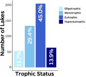 Once we have an estimate of the amount of algae in a waterbody, we can estimate its trophic state. Because algae are a basic food source for many aquatic animals, their abundance is a crucial factor in how much life a waterbody can sustain. In general, when measurements of total chlorophyll are high (indicating lots of algae are present), the waterbody will be more biologically productive.