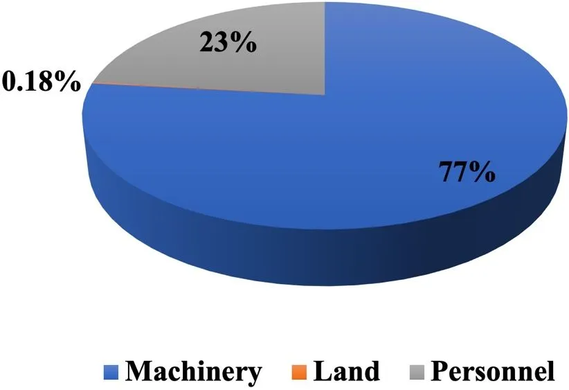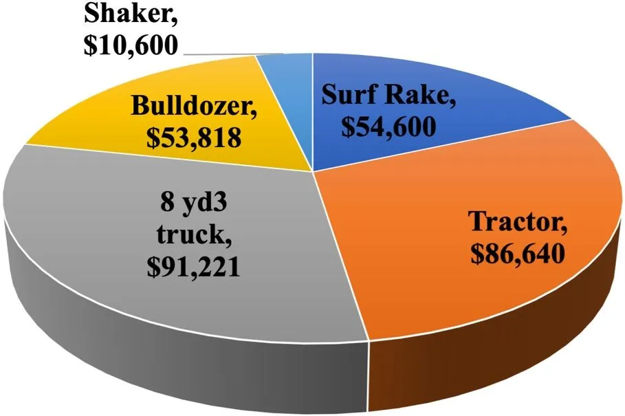Table 2 shows the total value for each of the major cost categories of a Sargassum composting facility. The total annual cost to clean the beach and manage the Sargassum compost pile is $386,872. Figure 3 illustrates the share of each of the costs by category. Machinery costs (surf rake, tractor, 8 yd3 truck, bulldozer, and shaker) are estimated to be 77% of the total cost, followed by personnel costs accounting for 23% of the total cost, and finally land costs which constitutes 0.18% of the total cost.