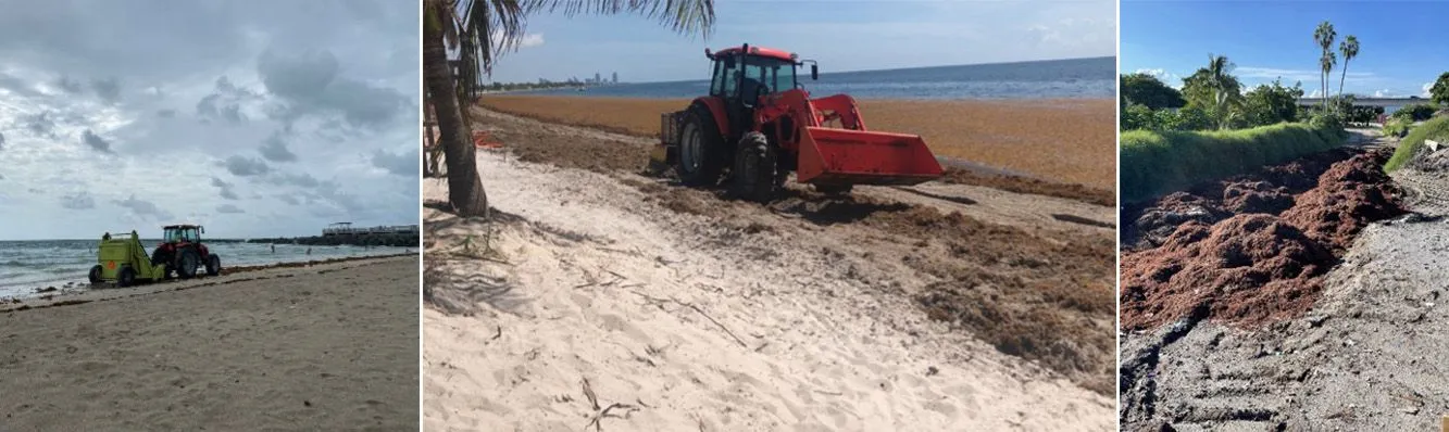 One city in south Florida has successfully reduced the impacts from large amounts of Sargassum spp. on the beach by implementing a unique and sustainable practice of composting. Ft. Lauderdale, located in Broward County, has been composting Sargassum spp. for the past 15 years. They have fine-tuned the collection process to optimize beach ecology and aesthetics. It uses a beach raker pulled behind a tractor to first clean the beach (Figure 2, left and middle). The Sargassum spp. is then transported to a city park where it is dried and placed into a compost pile (Figure 2, right). Once dried, the Sargassum spp. is then passed through a shaker to remove any debris before it is used as compost by the city or given away to city residents.