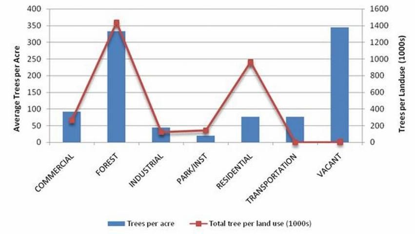 Within the city of Gainesville, the urban forest has an estimated 2,950,870 trees. Trees with diameters at breast height of less than 8 inches account for 49 percent of Gainesville's total tree population. However, the city's high proportions of large trees contribute most of the urban forest benefits (Nowak 1994, Escobedo et al. 2009a, Escobedo et al. 2009b, Escobedo et al. 2011). The highest density of trees occurs on vacant land or lands with no designated land use with an average of 345 trees/acre, followed by forest lands with 332 trees/acre, and then by commercial lands with 92 trees/ acre (Figure 2). The average tree density in Gainesville and all its land uses is 141 trees/acre, which is greater than many other cities in the United States which usually average 14 to 119 trees/acre (Nowak and others 2006). The high average number of trees per acre in Gainesville might be due to the abundance of smaller sized trees and high regeneration rates in the understory. The distribution of tree sizes and a higher proportion of smaller trees on less managed or natural areas due to natural regeneration is typical of many urban areas in the United States (Nowak 1994).