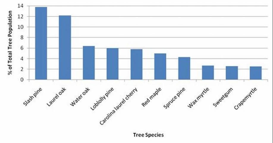 The 10 most common species accounted for 66 percent of all trees. The three most common species in the city are slash pine (Pinus elliottii), laurel oak (Quercus laurifolia), and water oak (Q. nigra), at 14, 12, and 6 percent of the total tree population, respectively (Figure 1). Dominant tree species varied by land use: Loblolly pine dominated industrial lands, comprising 35% of trees; laurel oak dominated residential landscapes, comprising 12% of trees; water oak dominated transportation corridors, comprising 40% of trees; and common persimmon and laurel oak dominated commercial lands, comprising 25% of trees. For natural areas and vacant lands water oak and slash pine dominated. With the exception of transportation corridors, species composition formed a diverse species mixture.