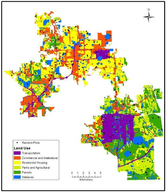 The methods employed in this assessment followed the protocols of the USDA Forest Service's Urban Forest Effects (UFORE) model, (https://www.nrs.fs.fed.us/tools/ufore/; Nowak and others 2008). In Florida, the model has been used in Gainesville (Escobedo and others 2009b [https://edis.ifas.ufl.edu/fr276]), Pensacola (Escobedo and others 2010 [https://edis.ifas.ufl.edu/fr293]), Miami-Dade (Escobedo and others 2011 [https://edis.ifas.ufl.edu/fr347]) and Tampa (Andreu and others 2009 [https://edis.ifas.ufl.edu/fr265]). Overall, 150 randomly selected 0.1-acre plots across 64,600 acres in Orlando were located and sampled for urban forest characteristics. Specifically field data were collected for surface ground cover, tree species and characteristics (woody plants greater than 2.5 cm in diameter at breast height or 4.5 feet above the surface), shrubs species and size, and tree to building distances. Specific methods and field data collected can be found in Escobedo and others 2010 and 2011 and land-use descriptions are based on the protocols from St. Johns River Water Management District (Florida Department of Environmental Protection 2018). The locations of the plots and the area for each land-use type are shown in Figure 1 and Table 1 respectively.