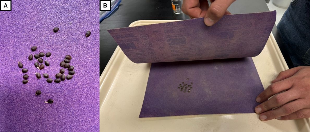 Passion fruit seeds scarified using sandpaper exhibit improved germination rates and faster sprouting compared to non-scarified seeds. To thin the seed coat properly, it is recommended to use commercial-grade sandpaper with a grit size between 100 and 150 (Figure 3). One sheet of sandpaper should be placed facing up on a flat surface with the passion fruit seeds spread in a single layer over the sandpaper. Another sandpaper sheet should be placed with the gritty side facing down, and the seeds should be rubbed gently using moderate pressure for three to five minutes, ensuring each seed comes in contact with the abrasive surfaces. Avoiding over-scarification is important since applying too much pressure can break the seeds and eroding too much of the seed coat can damage the plant embryo. Scarification is complete once scarring of the seed coat becomes visible as abrasions along the seed margins (Figure 4). Then, the seeds are ready to begin the germination process.
