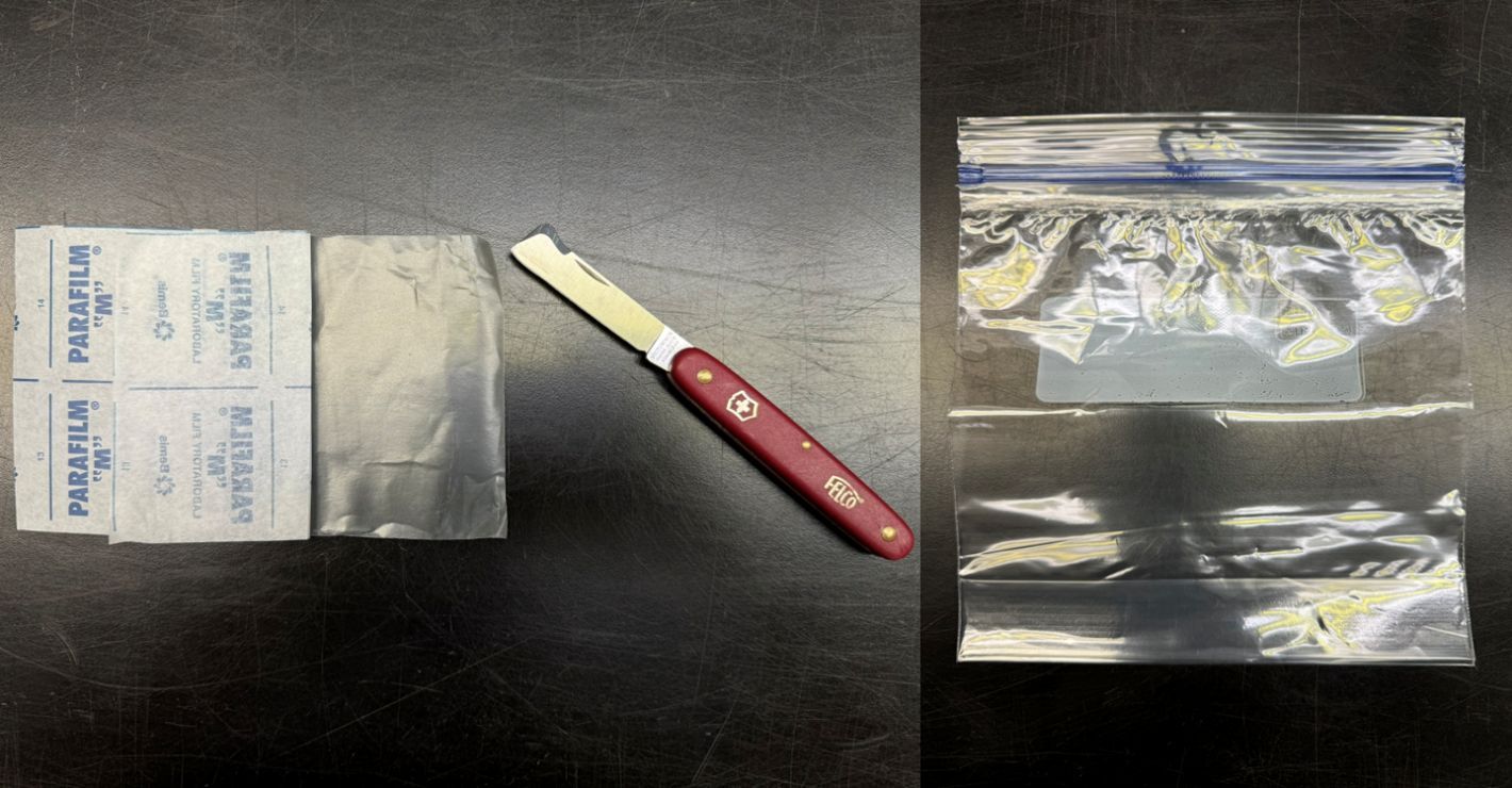 Clean cuts and precise alignment of vascular tissues are critical for a successful union between scion and rootstock. Covering the graft union and scion with a plastic bag helps preserve moisture and increase the success rate (Figure 8). Plants should be kept under shade and high relative humidity conditions for the first three to four days until the tip does not show any wilting signs. The plastic bag can be removed once active growth in the scion is visible.