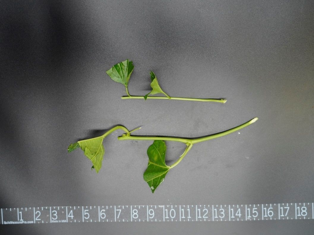 Before obtaining cuttings, garden clippers should be sanitized in a 10% chlorine solution to prevent disease transmission. Proper cuttings for propagation are obtained by cutting a stem segment at a 45-degree angle just above the bottom node because this method increases the surface area for root development. To encourage root growth, the cuttings should have two to four nodes (Figure 6), tendrils removed, and leaves cut in half, except for the newest leaves. Dipping the cuttings into a fungicide solution before propagation prevents disease development. Additionally, applying rooting hormones (available in powder, liquid, or gel forms) evenly on each cutting’s end surface can significantly promote root development.