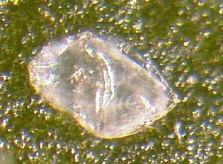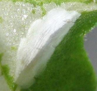 Leucospilapteryx venustella females oviposit a single egg on the underside of leaves. The white translucent eggs are minuscule with an approximate length of 0.34 ± 0.1 mm (0.0134 ± 0.004 in) (Figure 6). The chorion of a hatched egg is found at the initiation of the serpentine mine.