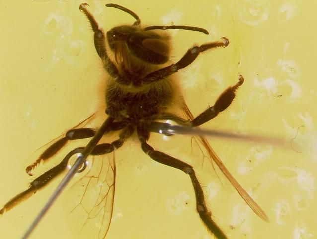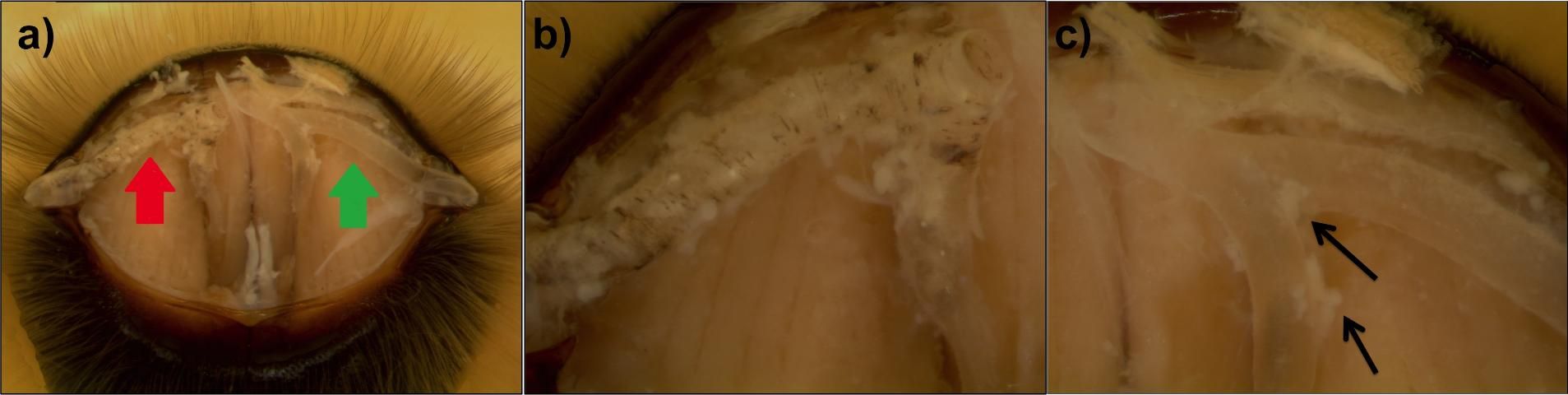 12. Record any scarring and/or lesions identified in either of the visible tracheae of the bee, discard the bee, and clean any debris from your dissecting dish.