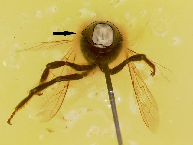 9. Reposition the bee so that the opening created by removing the head and first pair of legs is facing up and visible through the microscope (Figure 7).