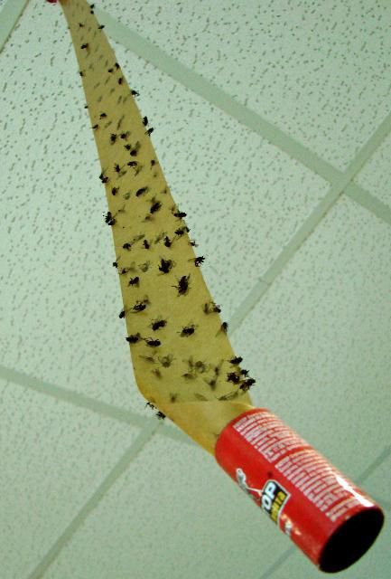 Flypaper (or fly ribbon) attracts many different flies to sticky adhesive, where they are permanently trapped. Commercial versions may contain sweetly fragrant additives that attract flies or other flying insects, and some contain an insecticide that kills trapped insects. A DIY flypaper can be made from strips cut from a thin plastic material (such as grocery bag) covered with a viscous honey or sugar solution. Once dried, the sticky strips can be hung up in locations where flies are most active.