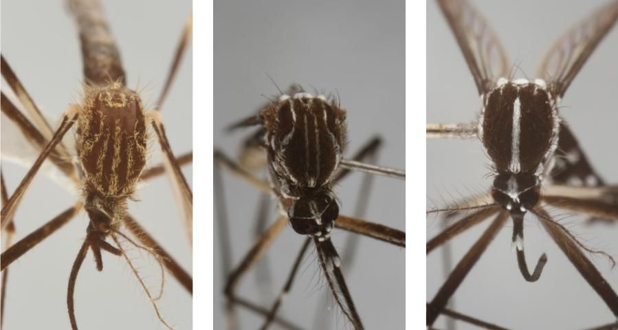Similar in appearance to other invasive but now established Aedes container-inhabiting mosquitoes in the United States, Aedes japonicus is diagnosable by the golden lyre-like pattern on its scutum. In contrast, the yellow fever mosquito, Aedes aegypti (Linnaeus), has a silver lyre on the scutum, and the Asian tiger mosquito, Aedes albopictus, has a silver line down the middle of the scutum (Figure 7).