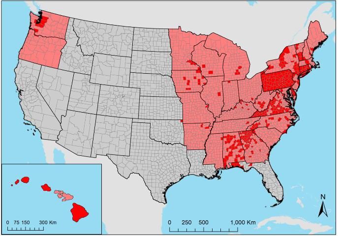 Aedes japonicus has also been found in all states east of the Mississippi river, in addition to midwestern states (Iowa, Missouri, and Minnesota), south central states (Arkansas and Oklahoma), the Pacific Northwest (Oregon and Washington), and Hawaii (Figure 3; Peyton et al. 1999, Bevins 2007, Kaufman and Fonseca 2014, Riles et al. 2017, Bradt et al. 2018). Aedes japonicus in Florida was first documented in Okaloosa County in 2012. It has since been recorded in other counties in the Panhandle of Florida, including Bay, Leon, Santa Rosa, and Walton counties (Riles et al. 2017).