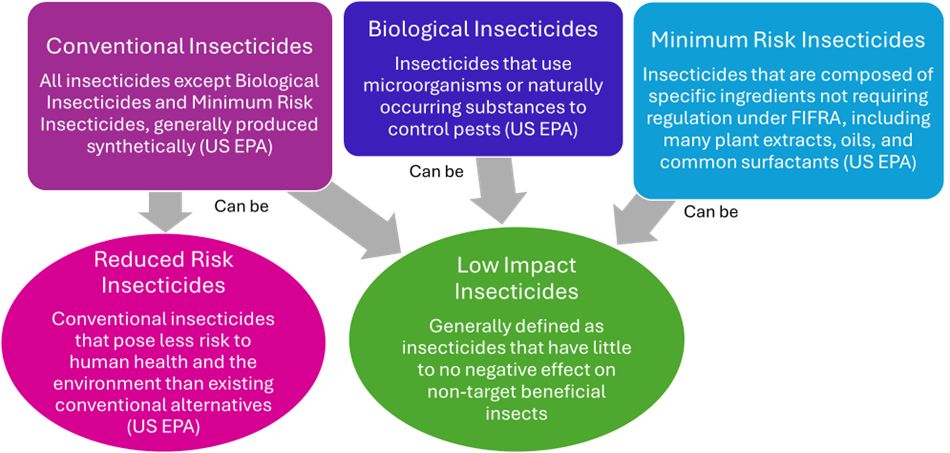 Importantly, “reduced risk” is not always in regard to the specific effects of insecticides on beneficial insects like butterflies and bees. Instead, insecticides that have little to no effect on beneficial insects are “low impact.” Some reduced risk insecticides can be low impact, but others are not. Biological insecticides and minimum risk insecticides can also be low impact. When working with insecticides, it is always recommended to read labels carefully to ensure the selected product will perform as expected. To reduce potential harm to beneficial insects, check the label for the specific wording “low impact.”