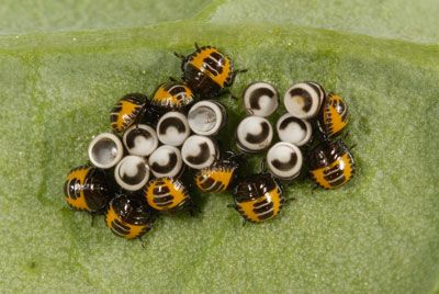 Eggs of the harlequin bug resemble tiny, white kegs standing on end in a double row (Figure 1). Approximately 12 eggs are laid together in one batch, usually on the underside of the leaves of the host plant. Each egg is marked by two broad black "hoops" and a black spot. The eggs hatch in four to 29 days, the time varying with the temperature.