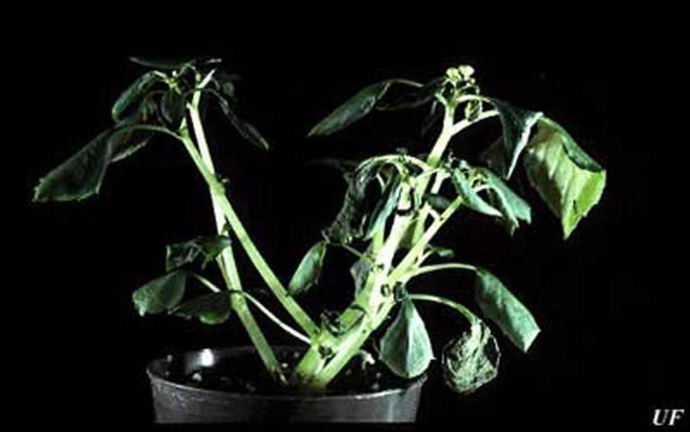 Unless African violets are examined carefully periodically, the cyclamen mite can be easily overlooked. This mite causes damage by sucking out plant juices, causing cells to collapse and providing entry points for plant diseases. This can lead to symptoms of damage such as leaf curling and leaf dying, before the mites are observed.