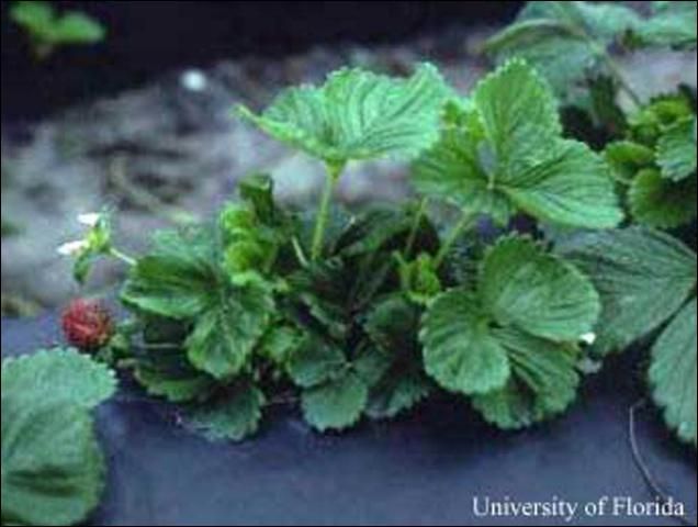 Infested plants may have a streaked and/or blotched appearance, distorted leaves with small, distorted flowers, fewer flowers than normal, or complete abortion of flower buds. Infested strawberry plants produce a roughened, wrinkled upper leaf surface, irregular folding and fluting of the leaf margins, and veins that bulge upward like blisters. Plants with mild injuries assume a dense appearance because petioles fail to elongate. A heavy infestation will kill African violets and cyclamens by dwarfing the leaves at the crown, with some leaves failing to open.