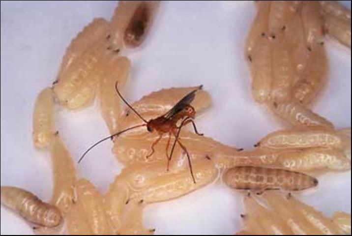 A solitary endoparasitic braconid wasp, Diachasmimorpha longicaudata (Ashmead), parasitizes larvae of the Caribbean fruit fly and trapping data has indicated a 40 percent reduction in Caribbean fruit fly populations. Diachasmimorpha longicaudata has been produced in Gainesville since 1990 in a joint state/federal mass rearing program. These tiny wasps attack fruit flies by laying eggs in the fly larvae. When the fly is in the pupal stage, the wasp egg hatches and the larva begins feeding on the fly pupa, killing the fly before it can develop into an adult. Although this classical biological control technique is effective in reducing Caribbean fruit fly populations, it is not an eradication technique.
