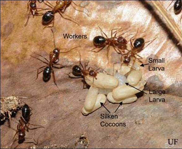 As with all members of the Order Hymenoptera, carpenter ants develop by complete metamorphosis, going through stages of the egg, larva, pupa, and adult worker or reproductive. Larvae are maggot-like, and pupae reside in silk cocoons and are often mistaken for eggs. Winged reproductives fly in the evening or night during the rainy season (May through November). Typically, a single queen, fertilized by a smaller short-lived male, will start a new colony, caring for her first brood of larvae until they develop into workers, which then begin to forage for food. Workers then care for the queen and ensuing brood. The colony will continue to grow and populations may reach several thousand workers. When the colony is two to five years old, depending on environmental conditions, new winged reproductives, or alates, will usually be sent out. Alates (winged reproductives) are observed from spring to fall, depending on the area and environmental conditions. Queenless satellite nests are often founded within 20 to 100 feet of a mature nest. Proximity of nests can lead to fighting among neighboring colonies.