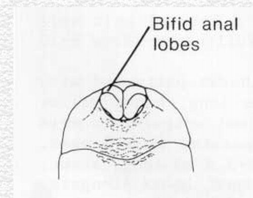 The two anterior spiracles, located laterally at base of first body segment behind the head, are modified ends of tracheae divided into small tubules or digits. Anterior spiracles are small and asymmetrical in shape, anterior margin of each, in Anastrepha striata, bearing 13 to 17 tubules arranged in a transverse row with median indentation as seen in profile. Caudal segment possesses a pair of posterior spiracles, each with three long spiracular openings called slits. Length, width, and position of these are useful characters in separating species. Posterior spiracular entrances of Anastrepha striata are about five times longer than wide; posterior spiracular hairs numerous and slender.