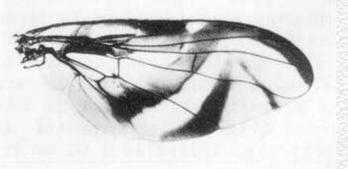 The adult fruit fly is rather small to medium sized; yellow brown, thorax patterned with black. The length of mesonotum is 2.45–3.57 mm (0.10 to 0.14 in). Wings are 5.9–7.7 mm (0.23 to 0.30 in) long, with yellow brown bands; costal and S bands touching on vein R4+5 and usually again just anterior to vein R2=3, leaving a small hyaline spot in cell R3; V band complete, separated from S band, outer arm narrow.