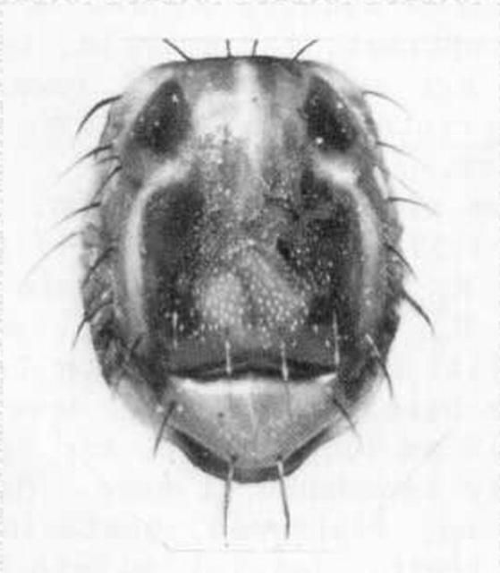 The larval head is a compound structure appearing as a single small segment with no definite head capsule. The oral cavity is composed of a longitudinal cavity that contains two black mouth hooks that move up and down. Outer portions of hooks protrude from preoral cavity, and bases articulate with pharyngeal skeleton. Shape of hooks and form of pharyngeal skeleton provide useful identification characters, as do buccal carinae. Anastrepha striata has eight to nine buccal carinae.