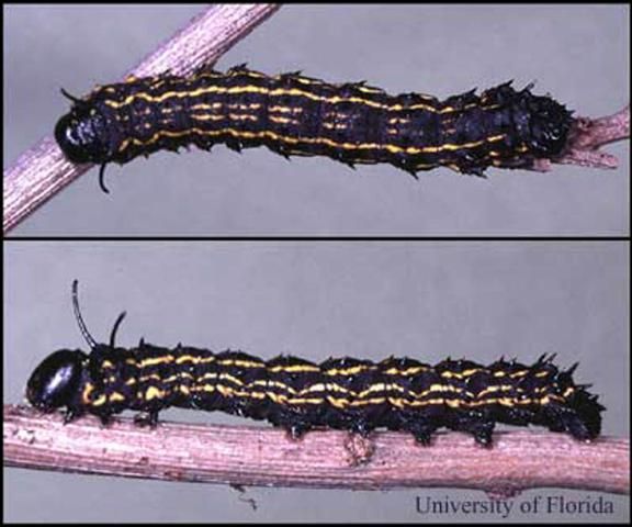 The yellowstriped oakworm, Anisota peigleri, is an occasional pest on oak trees in the southeastern United States. In Florida, outbreak populations defoliated laurel, water and Shumard oaks in Gainesville from 1996 until 2001. Even when defoliation is not severe, the falling frass (droppings) and large numbers of caterpillars are a major concern for many homeowners. Frass commonly stains driveways, walkways, pool decks and other outdoor structures.