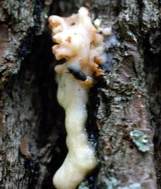 If there is sufficient resin pressure within the host, attacked trees will exhibit dime-sized, whitish or reddish-brown globs of resin and boring dust called "pitch tubes" on the bark at each point of beetle attack.