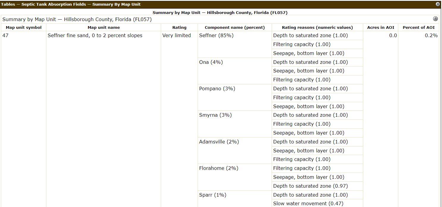 7. In this example, we see that the Seffner fine sand has a rating of Very Limited for septic system absorption fields. The reasons for this are given in the table and include things such as depth to saturated zone, filtering capacity, and seepage. The numeric values given in the rating reasons can range from 0.0 to 1.0, with values closer to zero meaning the soil is well-suited for a use and values closer to 1.0 meaning the soil is poorly suited for a use. In this example, the Seffner fine sand has a value of 1.0 in almost all cases, meaning it is poorly suited for septic tank absorption fields.