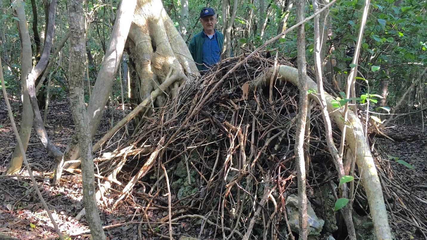 Key Largo woodrats are nocturnal, relying on one or a small network of stick-nests as refuge during the day. Under the cover of night, they emerge to forage for food and perform maintenance on their stick-nests. Woodrats are ecosystem engineers, the stick-nests they construct can grow to be quite large over time Over multiple generations some have grown to sizes over six feet long and four feet high (Figure 3). A variety of other species, both vertebrates and invertebrates, use these stick-nests as a resource for shelter or food. If stick-nests are not maintained, they decompose and lose structural integrity over time, so woodrats continuously add new sticks (Figure 4).