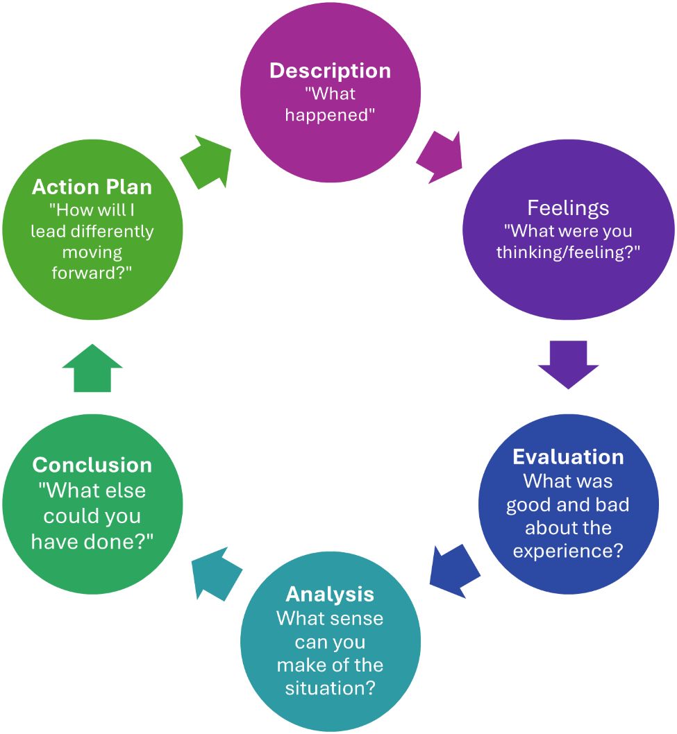 - Conclusions stage: In this stage, leaders begin to make conclusions from their evaluation and analysis stages. Conclusions should be both general and specific to one’s personal leadership. In this stage, leaders may ask themselves, “What could have been done differently,” and/or “How might this experience have been improved?” (Praveena et al., 2025).