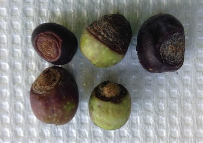 Fruit damage known as olive anthracnose (Figure 14) is a common problem reported by homeowners with olives in their landscape. Mainly caused by Colletotrichum acutatum, olive anthracnose should not be a major problem for growers, but you should be aware of the problem. Increased presence on flowers and fruit in the grove could warrant application of a fungicide. Olive anthracnose can lead to fruit drop, and fruit drop can lead to a mess in the landscape, especially near impervious surfaces like sidewalks and paved driveways. The damage on the fruit can cause the fruit to be more attractive to insects like fruit flies. Research is underway to determine whether olive anthracnose might lead to damaging levels of fruit fly infestations. Fruit flies are known to lower the quality of oil produced from infested olives.