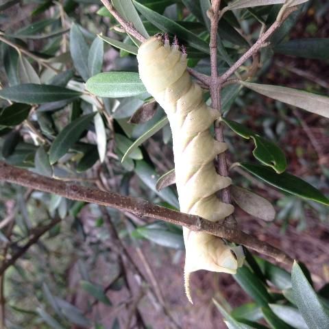 Manduca rustica, the rustic sphinx in the family Sphingidae, are commonly referred to as hornworms (Figure 7). These hornworms have been found defoliating olives in Florida. Their damage is apparent when an olive branch appears to be stripped of leaves. If you look below the branch, you will find the frass (excrement, Figure 8) from these caterpillars. Many growers report success with hand removal of these pests.