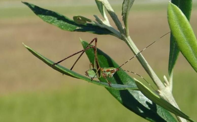 Growers have reported minor chewing and defoliation damage from grasshoppers and katydids (Figure 5) on olive trees in Florida. Katydids can also prove a nuisance when they lay eggs in leaf margins (Figure 6). At this time, managing grasshopper and katydid populations can only be achieved by maintaining a weed-free environment in and around groves or by applications of insecticides.