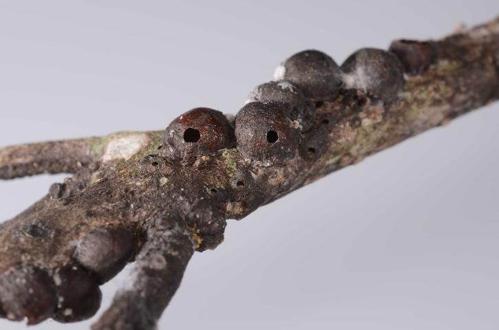 Many scale insects can survive on olives. In Florida, black scale (Saissetia oleae, Figure 11) has been identified from several olive groves. Black scale is also a pest of citrus in Florida, so if you have olives planted near citrus orchards you should be vigilant in monitoring for these pests. As mentioned above, ants can be an indicator of a scale infestation, as can sooty mold (mentioned below). Not all scale infestations require management, but they should be monitored for the presence of parasites. Parasites will leave a distinctive hole in the shell of the scales, as seen in Figure 12.