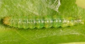 The olive shootworm, Palpita persimilis (Figure 9), has been found in central and southern Florida on various plants, but it is rarely reported on olive in Florida. The larvae (Figure 10) can cause defoliation of new growth. The larvae tie leaves together with silk to make nests on shoot tips. Feeding damage can be just on the epidermis of the leaf, or as larvae age they will chew holes in leaves. This insect is most commonly found feeding on Japanese privet (Ligustrum japonicum). Please let the authors know if you find this pest in your olive grove. We are trying to map its range distribution in Florida.
