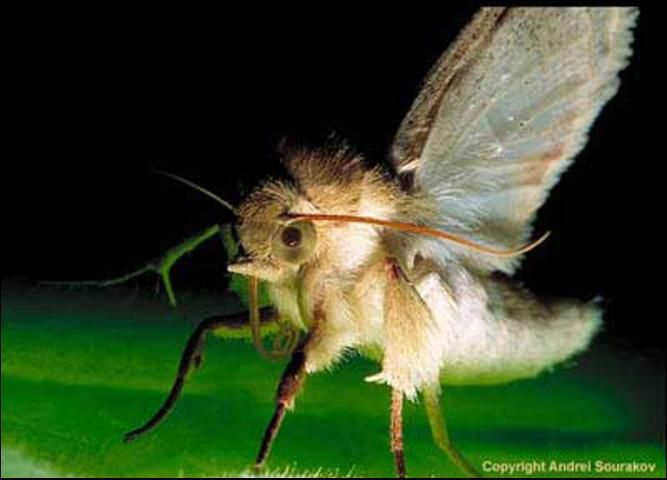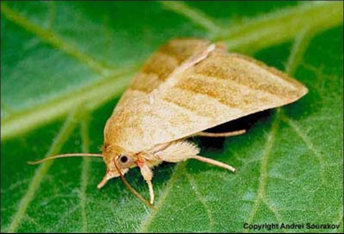 The moths are brownish in color and lightly tinged with green. The front wings are crossed transversely by three dark bands, each of which is often accompanied by a whitish or cream-colored border. Females tend to be darker in color. The hind wings are whitish, with the distal margin bearing a dark band. The moths measure 28 to 35 mm in wing span. The pre-oviposition period of females is about two days in length. Longevity of moths is reported to range from 25 days when held at 20°C (68°F) to 15 days at 30°C (86°F). A sex pheromone has been identified (Tumlinson et al. 1975).